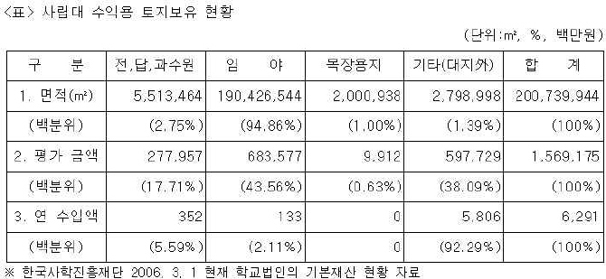 Çѱ¹»çÇÐÁøÈïÀç´Ü¿¡ µû¸£¸é 2006³â 3¿ù 1ÀÏ ÇöÀç 4³âÁ¦ »ç¸³´ë°¡ º¸À¯Çϰí ÀÖ´Â ¼öÀÍ¿ë ÅäÁö´Â 2¾ï73¸¸9,944§³À̸ç ÀÌ Áß 94.7%°¡ ÀÓ¾ßÀÌ´Ù. ÇÏÁö¸¸ Æò°¡±Ý¾×Àº °ø½ÃÁö°¡ ±âÁØÀ¸·Î 6,835¾ï7,700¸¸¿øÀÌ°í ¿©±â¼ ³ª¿Â ¿¬°£ ¼öÀÔ¾×Àº ÃÑ 1¾ï3,300¸¸¿ø¿¡ ºÒ°úÇÒ Á¤µµ·Î ¼öÀͼºÀÌ ¶³¾îÁø´Ù.(À§ Ç¥ Âü°í)