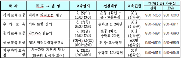 ÀÌ ´ëÇÐ »ç¹ü´ë ±³¼öµéÀº ¿À´Â 7¿ù19ÀϺÎÅÍ 8¿ù12ÀϱîÁö 5Â÷·Ê¿¡ °ÉÃÄ Áö¿ª ÃÊ․Áß․°íµîÇлý 710¸íÀ» ´ë»óÀ¸·Î ¡®Áö¸®·Î ´Ù½Ã º¸´Â ´ë±¸¡¯, ¡®±âÇÏ µµÇü Á¢±â¡¯, ¡®¼±±×¶ó½º ¸¸µé±â¡¯, ¡®2006 ¿¸°ÀÚ¿¬ÇнÀ±³½Ç¡¯, ¡®´ë±¸ÀÇ ¾Ï¼®°ú ȼ®¡¯ µîÀÇ ÁÖÁ¦·Î ÇÑ °ÀǸ¦ ÁøÇàÇÒ ¿¹Á¤ÀÌ´Ù.