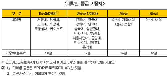 4´Ü°è·Î ±¸ºÐµÈ ÀÌµé ´ëÇÐ Ãâ½Åµé¿¡°Ô ±â¾÷ÀÌ ºÎ¿©ÇÑ °¡ÁßÄ¡´Â 1µî±Þ 20Á¡, 2µî±Þ 17Á¡, 3µî±Þ 14Á¡, 4µî±Þ 12Á¡À¸·Î µî±Þ°£ 3Á¡ÀÇ °ÝÂ÷°¡ ³´Ù°í ÀαÇÀ§´Â ¹àÇû´Ù.