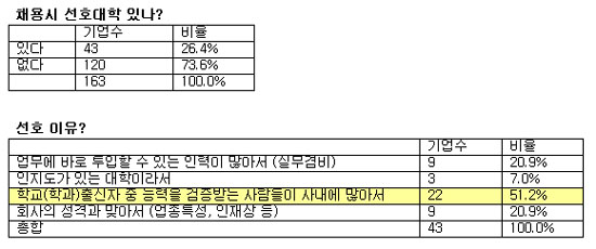 Á¶»ç´ë»ó ±â¾÷ÀÇ 73.6%(120°³»ç)´Â ä¿ë½Ã ¼±È£Çϴ ƯÁ¤ ´ëÇÐÀÌ ¾ø´Ù°í ÀÀ´äÇÑ ¹Ý¸é ¼±È£Çϰí ÀÖ´Â ´ëÇÐÀÌ ÀÖ´Ù°í ´äÇÑ ±â¾÷Àº 26.4%(43°³»ç)¿¡ ºÒ°úÇß´Ù.