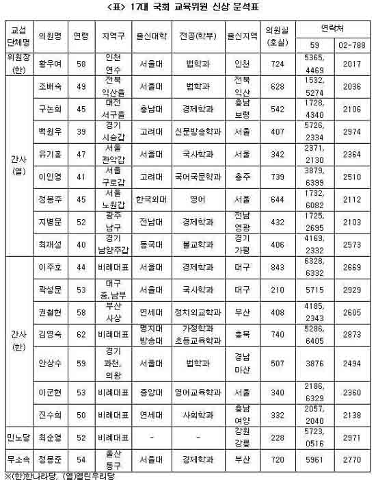 ÀÌ´Â º»Áö°¡ 17´ë ±¹È¸ ±³À°À§¿øµéÀÇ ÇзÂ, Àü°ø, ¿¬·É, Ãâ½Å Áö¿ª, ±³À°°ü·Ã °æ·Â, ÃÊÀç¼± ¹× ¼±°Å±¸ µî ÃÑ 11°³ Ç׸ñÀ» º¹ÇÕÀûÀ¸·Î ºÐ¼®ÇÑ °á°ú µå·¯³µ´Ù.