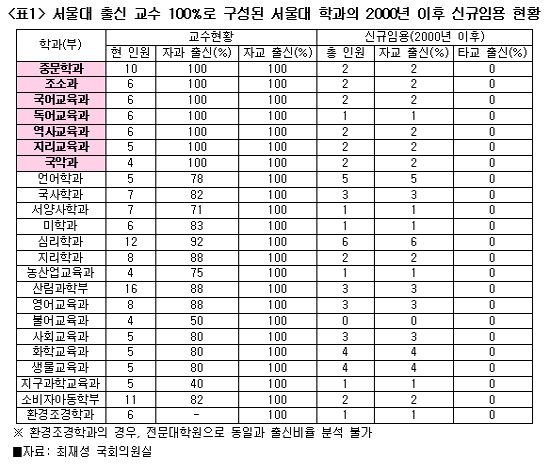 ÃÖÀ缺 ±¹È¸ ±³À°À§¿øÈ¸ ¼Ò¼Ó ¿¸°¿ì¸®´ç ÀÇ¿øÀº ÃÖ±Ù ¼¿ï´ë ÀÓ¿ë ±³¼ö Ãâ½Å´ëÇк° ÇöȲ°ú 2000³â ÀÌÈÄ ½Å±ÔÀÓ¿ë ±³¼ö Ãâ½Å´ëÇк° ÇöȲÀ» ºÐ¼®ÇÑ °á°ú ¼¿ï´ë °¢ Çаú ±³¼ö ±¸¼º°ú °ü·Ã À̰°Àº ÀÓ¿ë½ÇŰ¡ µå·¯³µ´Ù¸ç ¼¿ï´ë°¡ ¹®Á¦Àǽĵµ ¾ø°í ½ÃÁ¤ÀÇÁöµµ ¾ø´Ù°í °ÇÏ°Ô ºñÆÇÇß´Ù.