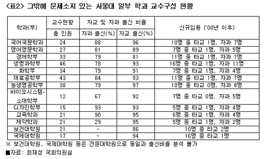 ´õ±¸³ª 2000³â ÀÌÈÄ ½Å±Ôä¿ë ±³¼ö 53¸íÀÌ ¸ðµÎ ¼¿ï´ë Ãâ½ÅÀÎ °ÍÀ¸·Î µå·¯³ª ÇØ´ç Çаú°¡ ¾Æ´Ñ Ÿ°ú Ãâ½ÅÀ» Ÿ±³ Ãâ½ÅÀ¸·Î °è»êÇÏ´Â µî ±³À°°ø¹«¿øÀÓ¿ë·ÉÀÇ Æ´»õ¸¦ ÀÌ¿ëÇÏ¸ç ½ÃÁ¤ÀÇ ±â¹Ì¸¦ º¸ÀÌÁö ¾Ê°í ÀÖ´Â °ÍÀ¸·Î ³ªÅ¸³µ´Ù. Áö³ 1999³â °ü·Ã¹ý °³Á¤ ÈÄ 2000³âºÎÅÍ ±¹°ø¸³´ë ±³¼öÀÓ¿ëÀÇ ¼ÒÀ§ ¡®Àκ긮µù Çö»ó¡¯À» ¸·±â À§ÇØ ±³À°´ç±¹Àº µ¿ÀÏ´ëÇÐ Ãâ½Å ±³¼ö ÀÓ¿ëºñÀ²À» Á¦ÇÑÇϰí ÀÖ´Ù.