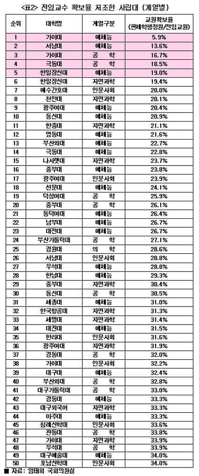 ÀÓ ÀÇ¿øÀÌ ÃÖ±Ù ¹ßÇ¥ÇÑ ÀÚ·á¿¡ µû¸£¸é ºÐ¼®´ë»ó 1¹é92°³ ´ëÇÐ Áß 42.2%¿¡ ÇØ´çÇÏ´Â 81°³±³(»ç¸³´ë 64°³±³, ±¹¸³»ê¾÷´ë 8°³±³, »ç¸³»ê¾÷´ë 9°³±³)ÀÇ ÀüÀÓ±³¼ö È®º¸À²ÀÌ 50%¸¦ ¹Øµ¹¾ÒÀ¸¸ç 42.7%ÀÎ 82°³±³(±¹°ø¸³´ë 8°³±³, »ç¸³´ë 65°³±³, ±¹¸³»ê¾÷´ë 1°³±³, »ç¸³»ê¾÷´ë 8°³±³)´Â ½Ã°£°»ç¸¦ Æ÷ÇÔÇØµµ ±³¿ø È®º¸À²ÀÌ 100%¸¦ ä¿ìÁö ¸øÇϰí ÀÖ´Â °ÍÀ¸·Î µå·¯³ª ±³À° ºÎ½Ç¿¡ ´ëÇÑ ¿ì·Á¸¦ ´õ¿í ½ÉȽÃÄ×´Ù.