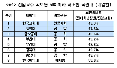 ÀÓÅÂÈñ ±¹È¸ ±³À°À§¿øÈ¸ ¼Ò¼Ó Çѳª¶ó´ç ÀÇ¿øÀÌ ÃÖ±Ù ¹ßÇ¥ÇÑ ¹Ù¿¡ µû¸£¸é »ê¾÷´ë¸¦ Æ÷ÇÔÇÑ ±¹°ø¸³ ¹× »ç¸³´ë µî Àü±¹ 1¹é92°³ 4³âÁ¦ ´ëÇÐÀÇ ÀüÀÓ±³¼ö È®º¸ºñÀ²À» ºÐ¼®ÇÑ °á°ú Æò±Õ 60.1%¿¡ ºÒ°úÇß´Ù.