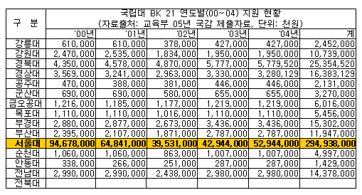 ÃÖ ÀÇ¿ø¿¡ µû¸£¸é Áö³ 2000³âºÎÅÍ 2004³â±îÁö ±¹¸³´ë BK21 »ç¾÷ Áö¿ø±Ý¾×Àº ÃÑ 4õ8¹é86¾ï¿©¿øÀ¸·Î ÀÌ °¡¿îµ¥ 60.4%°¡ ¼¿ï´ë·Î ÁýÁߵƴÙ. 99³â 1Â÷ Áö¿ø ÀÌÈÄ Áö³ÇرîÁö ÀÌ »ç¾÷¿¡ Áö¿øµÈ ±Ý¾×Àº ÃÑ 8õ1¹é27¾ï¿øÀ¸·Î ±¹°ø¸³´ë¿Í »ç¸³´ë¸¦ ÅëÆ²¾î ¼¿ï´ë°¡ Áö¿ø¹ÞÀº ±Ý¾×Àº Àüü Áö¿ø¾×ÀÇ 44.5%¿¡ ÇØ´çÇß´Ù. ¹Ý¸é »ç¸³´ë Àüü¿¡ Áö¿øµÈ ±Ý¾×Àº 1õ7¹é37¾ï¿ø¿¡ ±×ÃÆ´Ù. ¼¿ï´ë°¡ ¹ÞÀº ±Ý¾×ÀÇ 20%¸¦ Àüü »ç¸³´ë°¡ ³ª´² °¡Áø ¼ÀÀÌ´Ù.