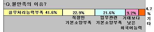 ¡®ºÒ¸¸Á·½º·´´Ù¡¯°í ÀÀ´äÇÑ 3¹é45¸íÀÇ ÀÀ´äÀÚµéÀº ¡®½Ç¹«Ã³¸®´É·Â ºÎÁ·¡¯À» ºÒ¸¸ÀÇ °¡Àå Å« ÀÌÀ¯·Î µé¾ú´Ù. ¹«·Á 41.6%¿¡ ´ÞÇßÀ¸¸ç ¡®Á÷ÀåÀÎÀ¸·Î¼ÀÇ ±âº»¼Ò¾ç ºÎÁ·¡¯ÀÌ 22.9%, ¡®¾÷¹«°ü·Ã ±âº»Áö½Ä ºÎÁ·¡¯ÀÌ 21.6%, ¡®±â´ëº¸´Ù ³·Àº ¿Ü±¹¾î ´É·Â¡¯ÀÌ 9.2%·Î ³ªÅ¸³ª ÇöÀå±³À°°ú ±âº»¼Ò¾ç±³À° ºÎÁ·ÀÌ ´ëºÎºÐ ¹®Á¦·Î Á¦±âµÆ´Ù.