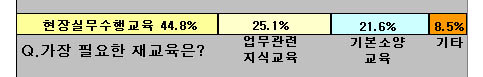 Àç±³À°ÀÇ ³»¿ë°ú °ü·Ã ÀÀ´äÀÚµéÀÌ °¡Àå ¸¹ÀÌ ÇÊ¿äÇÏ´Ù°í ÁöÀûÇÑ °ÍÀº ¡®ÇöÀå½Ç¹«¼öÇà±³À°¡¯À¸·Î 10¸í Áß 4~5¸í(44.8%)²Ã. ±×¹Û¿¡ ¡®¾÷¹«°ü·ÃÁö½Ä±³À°¡¯ 25.1%, ¡®±âº»¼Ò¾ç ±³À°¡¯ 21.6%, ¡®±âŸ¡¯ 8.5% ¼øÀ¸·Î Çʿ伺ÀÌ Á¦±âµÆ´Ù.