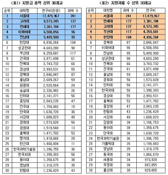 °í·Á´ë°¡ ¼¿ï´ëÀÇ µÚ¸¦ À̾î 1¹é37°ÇÀÇ Áö¿ø °úÁ¦¿¡ ´ëÇØ ÃÑ 85¾ï7õ3¹é¿© ¸¸¿øÀ» Áö¿ø¹Þ¾Æ Áö¿ø±Ý¾× ¼øÀ§ 2À§¸¦ Â÷ÁöÇß´Ù. Àü³â´ëºñ 8¾ï7õ¿© ¸¸¿øÀÌ Áõ°¡ÇÑ ±Ý¾×. ¿¬¼¼´ë°¡ °í·Á´ë¿¡ À̾î 3À§¿¡ ¿Ã¶ú´Ù. Áö¿ø±ÝÀº ÃÑ 73¾ï1¹é¿© ¸¸¿øÀ¸·Î °í·Á´ëº¸´Ù 12¾ï¿ø °¡·® µÚÁöÁö¸¸ Áö¿ø°úÁ¦´Â °í·Á´ëº¸´Ù 40¿©°ÇÀÌ ¸¹Àº 1¹é77°Ç¿¡ ´ÞÇß´Ù.