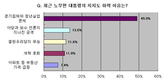 ¶Ç ÃÖ±Ù ³ë¹«Çö ´ëÅë·ÉÀÇ ÁöÁöµµ Ç϶ô ÀÌÀ¯¿Í °ü·Ã, Àüü ÀÀ´äÀÚ Àý¹Ý ¼öÁØÀÎ 49%°¡ `°æ±â ħü¿Í û³â½Ç¾÷¹®Á¦'¸¦ ²Å¾Æ °¡Àå ½É°¢ÇÑ ¹®Á¦·Î ÀνÄÇϰí ÀÖ´Â °ÍÀ¸·Î ³ªÅ¸³µ´Ù. ¾ß´ç°ú º¸¼ö ¾ð·ÐÀÇ Áö³ªÄ£ °ø°ÝÀÌ 13.6%, ¿¸°¿ì¸®´çÀÇ ¹«´ÉÀÌ 11.6%·Î ±× µÚ¸¦ À̾úÀ¸¸ç À̿ܿ¡µµ °³ÇõÈÄÅð 11.0%, ¾ÆÆÄÆ® µî ºÎµ¿»ê °¡°Ý ±Þµî 7.4% µîÀÇ ¼øÀ¸·Î ÀÀ´äÀÚ°¡ ¸¹¾Ò´Ù.