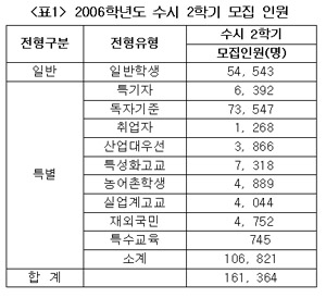 ³»´Þ 13ÀϺÎÅÍ ½ÃÀ۵Ǵ ¼ö½Ã 1Çб⠸ðÁýÀÌ 8¿ù ¸»¿¡ ¿Ï·áµÇ¸é 9¿ù 10ÀϺÎÅÍ 12¿ù 13ÀϱîÁö ¼®´Þ¿¡ °ÉÃÄ ¼ö½Ã 2Çб⠸ðÁý ÀüÇüÀÌ ½Ç½ÃµÈ´Ù. ÀÌ ¶§ ½ÅÀÔ»ýÀ» ¼±¹ßÇÏ´Â ´ëÇÐÀº ¼ö½Ã 1Çб⺸´Ù 70¿©°³±³°¡ ¸¹Àº 1¹é83°³±³·Î ¸ðÁýÀοøµµ 6¹è°¡ ¸¹Àº 16¸¸1õ3¹é¿©¸í¿¡ ´ÞÇÑ´Ù. Áö³ÇØ ´ëºñ 8õ¿©¸íÀ» ´õ »Ì´Â´Ù. ÀüÇüÀ¯Çüº°·Î ÀϹÝÀüÇüÀÌ 5¸¸4õ5¹é¿©¸í, Ưº°ÀüÇüÀÌ 10¸¸6õ8¹é¿©¸íÀ¸·Î ¼ö½Ã ¸ðÁýÀÇ Æ¯¼º»ó Ưº°ÀüÇü ¸ðÁýÀÌ ¸¹´Ù.