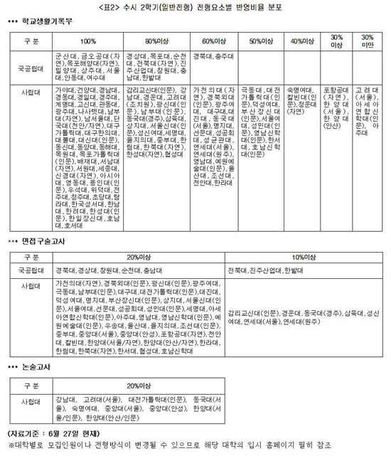 ¸éÁ¢¡¤±¸¼ú°í»ç Á¡¼öµµ ´ëÇп¡ µû¶ó ¹Ý¿µºñÀ²ÀÌ ´Þ¶ó »óÀÌÇÏ°Ô ¹Ý¿µµÈ´Ù. ¸éÁ¢À̳ª ±¸¼ú°í»ç Á¡¼ö°¡ 20%ÀÌ»ó ¹Ý¿µµÇ´Â ´ëÇÐÀº °æºÏ´ë, °æ»ó´ë, â¿ø´ë, ¼øÃµ´ë, Ãæ³²´ë µî ±¹¸³´ë 5°³±³¿Í ±¤ÁÖ¿©´ë, ´ë±¸´ë, ´ö¼º¿©´ë, ¼¿ï¿©´ë, ¾ÆÁÖ´ë, ¿µ³²´ë, ¿ï»ê´ë, Áß¾Ó´ë, Æ÷Ç×°ø´ë, ÇѾç´ë(ÀÚ¿¬) µî 42°³ »ç¸³´ë°¡ ÀÖ´Ù. ÀüºÏ´ë, ÁøÁÖ»ê¾÷´ë, Çѹç´ë µî ±¹¸³´ë¸¦ ºñ·ÔÇØ °æ¿î´ë, µ¿±¹´ë(°æÁÖ), »ïÀ°´ë, ¼º½Å¿©´ë, ¿¬¼¼´ë µî 7°³ »ç¸³´ë°¡ 10%¼±¿¡¼ ¹Ý¿µÅ°·Î Çß´Ù.
