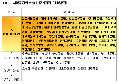 Àü±¹´ëÇк´¿ø ¹× Á¾ÇÕÆò°¡¿¡¼º¸´Ù´Â ´Ù¼Ò ±¤¹üÀ§ÇÏ°Ô ÀηÂ, Àåºñ, ½Ã¼³ µî 3°³ ºÎ¹®Ç׸ñÀ¸·Î ½Ç½ÃµÈ À̹ø ´ë´ÜÀ§ ÀÀ±ÞÀÇ·á±â°ü Æò°¡ °á°ú¿¡ µû¸£¸é ´ëÇüº´¿øÀÎ ±Ç¿ªº°ÀÀ±ÞÀÇ·á¼¾ÅÍ Áß¿¡¼ ¼¿ï±ÇÀÇ ¼¿ï´ëº´¿ø°ú ÀÎõ±ÇÀÇ °¡ÃµÀÇ´ë Á߾ӱ溴¿øÀÌ Aµî±ÞÀ» ¹Þ¾Æ ÃÖ°íÀÇ ¼ºÀûÀ» °Åµ×´Ù. ±¤ÁÖ±ÇÀÇ Àü³²´ëº´¿ø, °æ±â±ÇÀÇ °¡Å縯´ë ÀÇÁ¤ºÎ¼º¸ðº´¿ø, ¿¬¼¼´ë(¿øÁÖ) ¿øÁֱ⵶º´¿øÀº Bµî±ÞÀ¸·Î ¾çÈ£ ÆÇÁ¤À» ¹Þ¾Ò´Ù.
