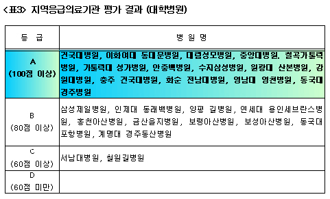 ¶Ç °¡Àå ±Ô¸ð°¡ ÀûÀº Á¾ÇÕº´¿øÀÎ Áö¿ªÀÀ±ÞÀÇ·á±â°ü Æò°¡¿¡¼´Â °Ç±¹´ëº´¿ø, ÀÌÈ¿©´ë µ¿´ë¹®º´¿ø, Á߾Ӵ뺴¿ø, ¿ø±¤´ë »êº»º´¿ø, °¿ø´ëº´¿ø, ȼø Àü³²´ëº´¿ø, µ¿±¹´ë °æÁÖº´¿ø µî 14°³ ´ëÇк´¿øÀÌ Aµî±Þ ÆÇÁ¤À» ¹ÞÀº ¹Ý¸é ¼³²´ëº´¿ø°ú °¡ÃµÀÇ´ë ö¿ø±æº´¿øÀº Cµî±ÞÀ¸·Î ±¸ºÐµÆ´Ù.