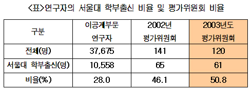 Á¤Ã¥À§ ¹ßÇ¥¿¡ µû¸£¸é À̰ø°è Àüü ¿¬±¸ÀÚ 3¸¸7õ¿©¸í Áß ¼¿ï´ë Ãâ½ÅÀº ºÒ°ú 1¸¸5¹é¿©¸íÀ¸·Î 28% ¼öÁØÀÎ µ¥ ¹ÝÇØ 2003³â ±¹°¡ÁöÁ¤¿¬±¸½Ç ÃÖÁ¾ Áö¿ø ´ë»ó ¿¬±¸ÀÚ Áß ¼¿ï´ë ÇкΠÃâ½ÅÀÚ°¡ 54.5%¿¡ ´ÞÇØ ¶Ñ·ÇÇÑ ¼¿ï´ë ½ò¸²Çö»óÀ» º¸¿©Áá´Ù. ¶Ç Æò°¡À§¿ø 1¹é20¸í Áß ¼¿ï´ë ÇкÎÃâ½ÅÀº 61¸íÀ¸·Î 50.8%¸¦ Â÷ÁöÇß´Ù. Àüü ¿¬±¸ÀÚ Áß ¼¿ï´ë Ãâ½Å ºñÁß¿¡ ºñÇØ ¼¿ï´ë Ãâ½Å Áö¿ø ´ë»óÀÚ ºñÁßÀÌ µÎ¹è¸¦ ³Ñ°í ¿ª½Ã ¼¿ï´ë Ãâ½Å Æò°¡À§¿ø ºñÁßµµ µÎ¹è ÀÌ»óÀÎ °ÍÀ¸·Î ³ªÅ¸³ °Í. ´õ±¸³ª Æò°¡À§¿øÈ¸ÀÇ Àý¹ÝÀ» ¼¿ï´ë Ãâ½ÅÀÌ Â÷ÁöÇϰí ÀÖ´Â »óȲÀÌ´Ù.