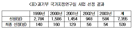 Áö³ 1999³âµµ¿¡ °³½ÃµÈ ±¹°¡ÁöÁ¤¿¬±¸½Ç »ç¾÷Àº Áö³ 2003³â±îÁö ÃÑ 5¹é39°³ ±¹°¡ÁöÁ¤¿¬±¸½ÇÀ» ÁöÁ¤, ¿¬±¸ºñ¸¦ Áö¿øÇßÀ¸¸ç Áö³ ÇØ »ç¾÷ÀÌ Á¾°áµÉ ¿¹Á¤À̾úÀ¸³ª ´Ù½Ã ¿¬ÀåµÅ ¿ÃÇØ»ç¾÷ ¼±Á¤Æò°¡°¡ ¸¶¹«¸®µÈ´Ù.