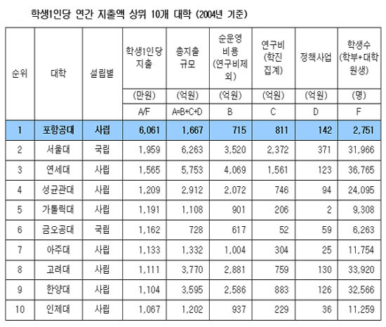 ÀÌ ÀÇ¿ø¿¡ µû¸£¸é Çлý 1Àδç ÁöÃâ¾×Àº Æ÷Ç×°ø´ë°¡ 6õ61¸¸¿øÀ¸·Î °¡Àå ¸¹¾ÒÀ¸¸ç ¼¿ï´ë°¡ 1õ9¹é59¸¸¿øÀ» ÁöÃâ, ±× µÚ¸¦ À̾ú´Ù. ¿¬¼¼´ë 1õ5¹é65¸¸¿ø, ¼º±Õ°ü´ë 1õ2¹é9¸¸¿ø, °¡Å縯´ë 1õ1¹é91¸¸¿øÀÇ ¼øÀ¸·Î Çлý °³Àο¡ ´ëÇÑ ÁöÃâÀÌ ¸¹¾Ò´Ù.