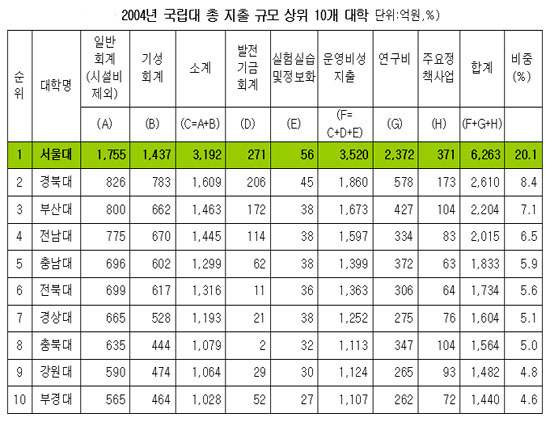 Àüü ÁöÃ⠱Ը𿡼´Â ¼¿ï´ë°¡ ¿î¿µºñ 3õ5¹é20¾ï¿ø, ¿¬±¸ºñ 2õ3¹é72¾ï¿ø, ±âŸ Á¤Ã¥»ç¾÷ºñ¸¦ Æ÷ÇÔ, ¿¬°£ 6õ2¹é63¾ï¿øÀ» ÁöÃâÇÏ´Â °ÍÀ¸·Î ³ªÅ¸³ª ±¹³» ´ëÇÐ Áß ±Ô¸ð°¡ °¡Àå Å« °ÍÀ¸·Î µå·¯³µ´Ù. Àüü 24°³ 4³âÁ¦ ±¹¸³´ë ÁöÃâ ÃѾ×ÀÌ 3Á¶1õ1¹é85¾ï¿øÀÓÀ» °¨¾ÈÇϸé 5ºÐÀÇ 1À» ¼¿ï´ë°¡ ´Üµ¶À¸·Î ¾²°í ÀÖ´Â ¼À. ¼¿ï´ëÀÇ °æ¿ì ÀϹÝȸ°è¿Í ±â¼ºÈ¸°è¸¸ º¸¸é 3õ1¹é92¾ï¿øÀ¸·Î 24°³ ´ëÇÐ Àüü(21,296¾ï¿ø)ÀÇ 14.9%¿´À¸³ª ¿¬±¸ºñ ±Ô¸ðÀÇ 37.3%, ¹ßÀü±â±Ý ÁöÃâÀÇ 22.7%, BK21, ´©¸®»ç¾÷ µî ÁÖ¿äÁ¤Ã¥ »ç¾÷ÀÇ 20% °¡·®À» Â÷ÁöÇϰí ÀÖ¾î °á°úÀûÀ¸·Î ¼¿ï´ë ÁöÃâ ºñÁßÀÌ 20%±îÁö ³ô¾ÆÁ³´Ù.