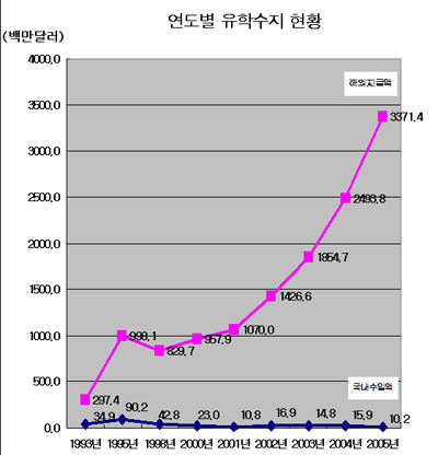 Çѱ¹ÀºÇà °æÁ¦Åë°è½Ã½ºÅÛ(http;//ecos.bok.or.kr)¿¡ µû¸£¸é Áö³ÇØ ±¹³»·Î À¯ÇÐÀ̳ª ¿¬¼ö¸¦ ´Ù´Ï·¯ ¿Â ¿Ü±¹ ÇлýµéÀÌ µé¿©¿Â ±¹³» ¼öÀÔ¾×Àº 1õ20¸¸´Þ·¯·Î ÇÑÈ 1¹é¾ï¿øÀ» ´Ù¼Ò »óȸÇÏ´Â ¼öÁØ¿¡ ±×ÃÆ´Ù. ±×·¯³ª ¿ì¸® ÇлýµéÀÌ ¹Ì±¹, ÀϺ» µî ÇØ¿Ü¿¡ À¯ÇÐÇϱâ À§ÇØ °¡Á®°£ ÇØ¿Ü Áö±Þ¾×Àº 33¾ï7õ1¹é40¸¸´Þ·¯·Î ÇÑÈ 3Á¶3õ7¹é¾ï¿øÀÌ ³Ñ¾î ÀûÀÚÆøÀº ¹«·Á 33¾ï6õ¸¸´Þ·¯¿¡ ´ÞÇß´Ù. ÀÌ´Â Àü³â´ëºñ ÀûÀÚÆøÀÌ 35.6% Áõ°¡ÇÑ ¼öÄ¡·Î ±Ý¾×À¸·Î´Â 8¾ï8õ¸¸´Þ·¯ÀÇ ¼Õ½ÇÀÌ ³µ´Ù.
