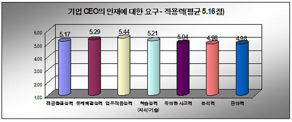 ±â¾÷ÀÌ °¡Àå ¿ä±¸ÇÏ´Â ´É·ÂÀ¸·Î ±â¾÷ CEOµéÀº Àû¿ë·ÂÀ» ²Å¾Ò´Ù. Àû¿ë·ÂÀº 6Á¡ ôµµ¿¡¼ 5.16Á¡À¸·Î 100Á¡ ¸¸Á¡ ȯ»ê½Ã 86.2Á¡¿¡ ´ÞÇØ »ó´ëÀûÀ¸·Î ±â¾÷¿¡¼ °¡Àå ¿ä±¸ÇÏ´Â ´É·ÂÀ¸·Î Æò°¡µÆÀ¸¸ç ¿ä±¸¼öÁصµ ¸Å¿ì ³ôÀº °ÍÀ¸·Î ³ªÅ¸³µ´Ù.
