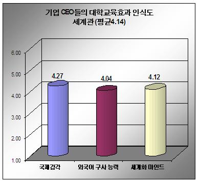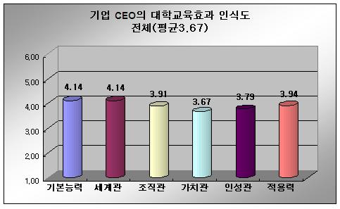 ±â¾÷ CEO´Â ¶Ç ±âº»´É·Â°ú ¼¼°è°ü¿¡ ´ëÇÑ ´ëÇб³À° È¿°ú¸¦ ³ôÀÌ Æò°¡ÇßÀ¸¸ç ±× °¡¿îµ¥ ±â¼ú °ü·Ã ¾÷¹«»ó½Ä°ú ±¹Á¦°¨°¢¿¡ ´ëÇÑ ´ëÇб³À° È¿°ú°¡ ³ô´Ù°í ÀνÄÇß´Ù. ÇÏÁö¸¸ »ó´ëÀûÀ¸·Î ±â¾÷ CEOµéÀÇ ¿ä±¸¼öÁØÀÌ ¸Å¿ì ³ô¾Ò´ø ¿Ü±¹¾î±¸»ç´É·Â¿¡ ´ëÇÑ ´ëÇб³À° È¿°ú¿¡ ´ëÇØ¼´Â ±×´ÙÁö ÀÎÁ¤ÇÏÁö ¾Ê°í ÀÖ´Â °ÍÀ¸·Î µå·¯³µ´Ù.