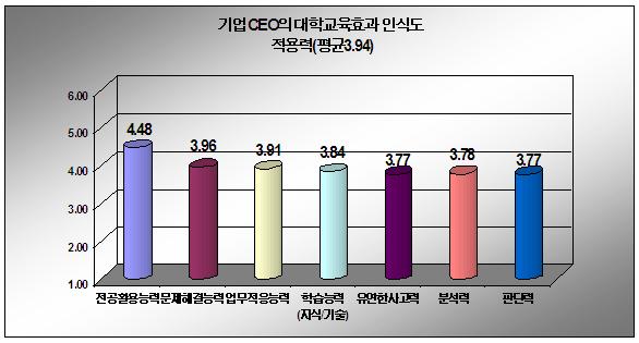 Àüü ´É·Â Áß ±â¾÷ CEOµéÀÌ °¡Àå ¿ä±¸ÇÏ´Â ´É·ÂÀ¸·Î ²ÅÈù Àû¿ë·ÂÀÇ °æ¿ìµµ ´ëÇб³À°ÀÇ È¿°ú Á¡¼ö°¡ 3.94·Î 100Á¡ ¸¸Á¡¿¡ 65.7Á¡¿¡ ÇØ´çÇØ »ó´ëÀûÀ¸·Î ´Ù¸¥ ´É·Âµé°ú ´ëºñ ´ëÇб³À° È¿°ú°¡ ³·¾Ò´Ù. ÇÏÁö¸¸ Àû¿ë·Â Áß Àü°øÈ°¿ë´É·ÂÀº 4.48·Î ´Ù¼Ò È¿°ú°¡ ÀÖ´Ù°í Æò°¡µÅ Àüü ´ëÇб³À°ÀÇ È¿°ú Á¶»ç¿¡¼ °¡Àå ´«¿¡ ¶è °á°ú¿´´Ù.