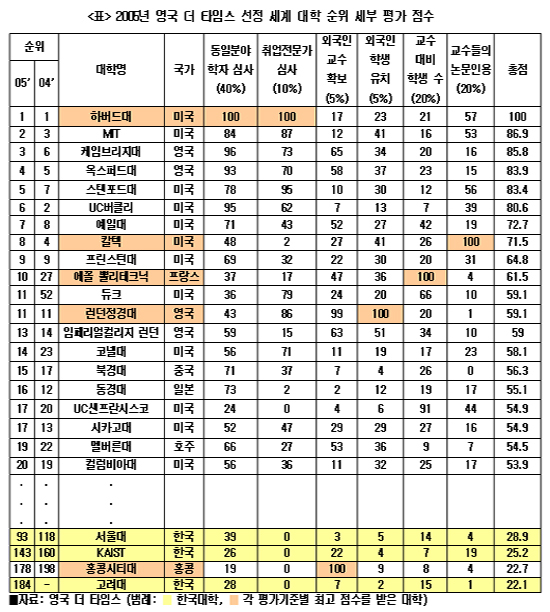 ´õ ŸÀÓ½º ¼¼°è ´ëÇÐ ¼øÀ§ ¼ºÀû ... KAIST 25.2Á¡, °í·Á´ë 22.1Á¡