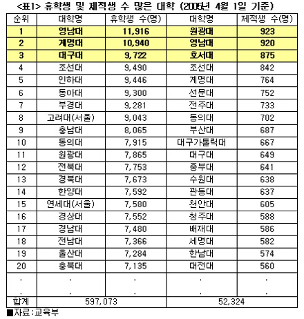 ±³À°ºÎ¿¡ µû¸£¸é ¿ÃÇØ 4¿ù 1ÀÏÀ» ±âÁØÀ¸·Î °¡Àå ÈÞÇлýÀÌ ¸¹Àº ´ëÇÐÀº ¿µ³²´ë·Î 1¸¸1õ9¹é¿©¸íÀÌ ÈÞÇлóÅÂÀÎ °ÍÀ¸·Î ³ªÅ¸³µÀ¸¸ç °è¸í´ë°¡ 1¸¸9¹é¿©¸íÀ¸·Î ±× µÚ¸¦ µû¶ú´Ù. ÀÌµé µÎ ´ëÇÐÀº ÈÞÇлýÀÌ 1¸¸¸í¿¡ ´ÞÇß´Ù.