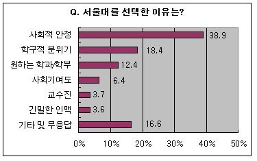 ¼¿ï´ë¸¦ ÁøÇÐÇÑ ÀÌÀ¯¿Í °ü·Ã ¡®»çȸÀû ¾ÈÁ¤¡¯À̶ó°í ´äÇÑ ½ÅÀÔ»ýÀÌ 38.9%¿¡ ´ÞÇØ ¾ÐµµÀûÀ¸·Î ¸¹¾Ò´Ù. ¡®Çб¸Àû ºÐÀ§±â¡¯(18.4%), ¡®¿øÇÏ´Â Çаú/ÇкΡ¯(12.4) ¼ø. ³²ÇлýÀÇ °æ¿ì ¡®»çȸÀû ¾ÈÁ¤¡¯°ú ¡®±ä¹ÐÇÑ Àθơ¯ ¶§¹®¿¡ ¼¿ï´ë¸¦ ¼±ÅÃÇß´Ù´Â ÀÀ´äÀÌ ¿©Çлý¿¡ ºñÇØ »ó´ëÀûÀ¸·Î ¸¹¾ÒÀ¸¸ç ¹Ý´ë·Î ¿©ÇлýÀº ¡®Çб¸Àû ºÐÀ§±â¡¯, ¡®¿øÇÏ´Â Çаú/ÇкΡ¯¶ó´Â ÀÀ´ä ºñÀ²ÀÌ ´õ ¸¹¾Ò´Ù.