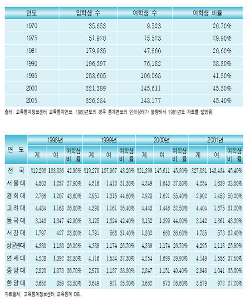 Àü¹ÝÀûÀÎ ¿©Çлý ºñÀ²ÀÇ »ó½Â¿¡µµ ºÒ±¸ÇÏ°í ¼º±Õ°ü´ë, ÇѾç´ë µî ÀϺΠ´ëÇÐÀº ±×·¯³ª ¿©ÀüÈ÷ 70³â´ë ¼öÁØÀÎ 20%¸¦ À¯ÁöÇϰí ÀÖ´Â °ÍÀ¸·Î ³ªÅ¸³µ´Ù.