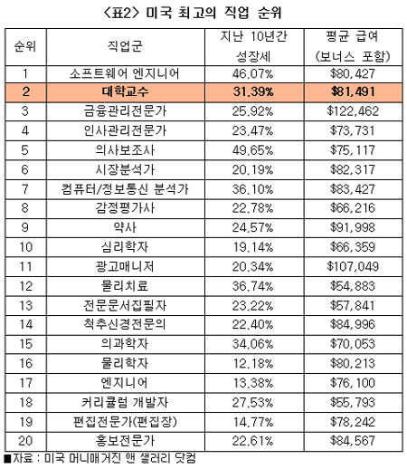 Áö³ 10³â°£ÀÇ ´ëÇб³¼ö Á÷¾÷ÀÇ ¼ºÀå·üÀº 31.39%·Î Áö³ 10³â°£ °¡Àå ¼ºÀå¼¼°¡ ³ôÀº 10°³ Á÷¾÷ ¼øÀ§³ª °¡Àå ±Þ¿©¼öÁØÀÌ ³ôÀº 10°³ Á÷¾÷ ¼øÀ§¿¡´Â µéÁö ¸øÇß´Ù. ±Þ¿©¼öÁØÀº °¡Àå ¸¹ÀÌ ¹ÞÀº °æ¿ì 55¸¸´Þ·¯±îÁö À̸¥´Ù. ÇÏÁö¸¸ ´ëºÎºÐÀÇ ±³¼öµéÀº ±× Àý¹Ý ¼öÁØ¿¡ ±×Ä¡°í Àֱ⠶§¹®. Æò±Õ ±Þ¿©´Â 8¸¸1õ5¹é´Þ·¯·Î ÇÑÈ 8õ1¹é49¸¸¿ø¿¡ »ó´çÇß´Ù.