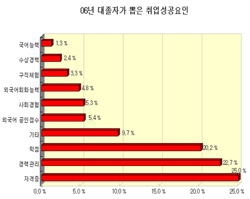 Ãë¾÷¿¡ ¿µÇâÀ» ¹ÌÄ£ ¿äÀÎÀ¸·Î °¢Á¾ ÀÚ°ÝÁõÀÌ 25%·Î °¡Àå ³ô¾Ò°í °æ·Â °ü¸®(22.7%), Àü°ø ¹× ÇÐÁ¡(20.2%)¼øÀ¸·Î ²ÅÇû´Ù.