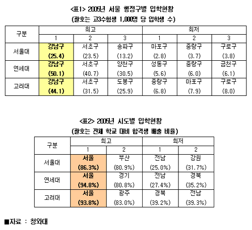 ¼¿ï´ë ÀÔÇÐÀÚ °¡¿îµ¥ ¼¿ï °³²±¸ Ãâ½ÅÀÌ 1õ¸í ´ç 25.4¸í¿¡ ´ÞÇØ °¡Àå ÀûÀº ¼¿ï´ë ÀÔÇÐÀÚ¸¦ ¹èÃâÇÑ ¸¶Æ÷±¸ÀÇ 9.1¹è¿¡ ´ÞÇÏ´Â °ÍÀ¸·Î ³ªÅ¸³µÀ¸¸ç ¼¿ï ¼ÒÀç °í±³ Áß ¼¿ï´ë ÀÔÇлýÀ» ¹èÃâÇÑ °í±³ÀÇ ºñÁßÀÌ 86.3%·Î Àü±¹ ½Ãµµ °¡¿îµ¥ °¡Àå ³ôÀº °ÍÀ¸·Î µå·¯³µ´Ù°í û¿Í´ë ±³À° ¾ç±ØÈ º¸°í¼°¡ ¹àÈ÷¸é¼ ´Ù½Ã ºÒÀÌ ÁöÆìÁö°Ô µÆ´Ù.