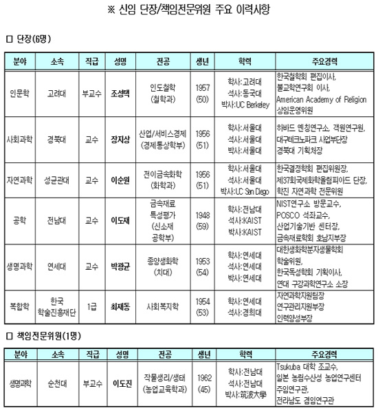 Àι®ÇдÜÀå¿¡ °í·Á´ë Á¶¼ºÅà ±³¼ö, »çȸ°úÇдÜÀå¿¡ °æºÏ´ë ÀåÁö»ó ±³¼ö, ÀÚ¿¬°úÇдÜÀå¿¡ ¼º±Õ°ü´ë À̼ø¿ø ±³¼ö, °øÇдÜÀå¿¡ Àü³²´ë À̵µÀç ±³¼ö, »ý¸í°úÇдÜÀå¿¡ ¿¬¼¼´ë ¹Ú±¤±Õ ±³¼ö, »ý¸í°úÇÐ´Ü Ã¥ÀÓÀü¹®À§¿ø¿¡ ¼øÃµ´ë À̵µÁø ±³¼ö µî ¿ÜºÎ Àü¹®°¡¸¦ ¼±ÀÓÇß´Ù.