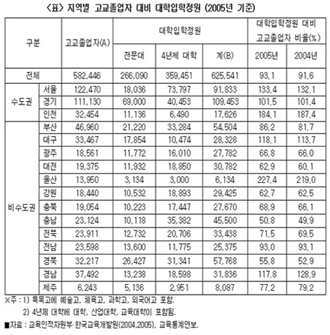 Áö¿ªº°·Î´Â ¿ï»ê°ú °°ÀÌ Á¤¿øÀÇ µÎ¹è°¡ ³Ñ´Â °í±³Á¹¾÷ÀÚ°¡ ¹èÃâµÈ Áö¿ªÀÌ ÀÖ´Â ¹Ý¸é Ãæ³²ÀÇ °æ¿ì °í±³Á¹¾÷ÀÚ ¼ö°¡ ´ëÇÐÀÔÇÐÁ¤¿øÀÇ 50.8%¿¡ ºÒ°úÇÏ°í °æºÏ 55.8%, °¿ø 62.7%·Î À̵é Áö¿ªÀº ƯÈ÷ ÇØ´ç Áö¿ª¿¡¼ÀÇ ÀÔÇÐÀÚ¿øÀÌ ÅξøÀÌ ºÎÁ·ÇÑ °ÍÀ¸·Î ³ªÅ¸³µ´Ù.