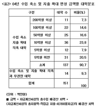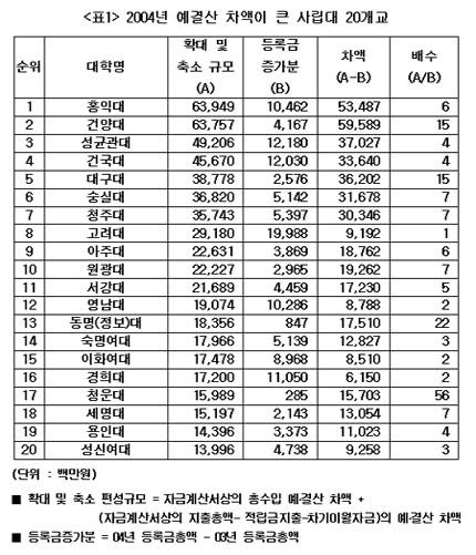 Çѱ¹´ëÇб³À°¿¬±¸¼Ò¿¡ ÀÇÇϸé Áö³ 2004³â ÁöÃ⿹»êÀ» 1Á¶ 1¹é33¾ï¿ø ºÎÇ®¸®°í ¼öÀÔ¿¹»êÀº 1¹é20¾ï¿ø Ãà¼Ò Æí¼ºÇØ ÃÑ 1Á¶ 2¹é52¾ï¿ø ±Ô¸ðÀÇ ¿¹°á»ê Â÷¾×ÀÌ ¹ß»ýÇß´Ù. ÀÌ´Â Àü³â ´ëºñ 2004³â µî·Ï±Ý Áõ°¡ºÐ 4õ3¹é24¾ï¿øÀÇ 2.4¹è¿¡ ÇØ´çÇÑ´Ù.