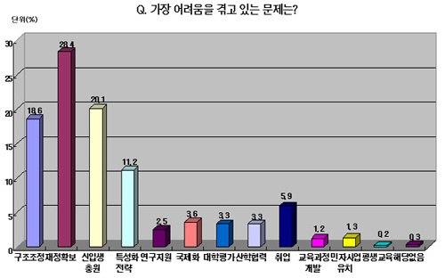 Á¶»ç°á°úµµ ´ëÇÐÀÇ »ï°í(3ÍÈ)°¡ ¡®ÀçÁ¤ È®º¸¡¯, ¡®½ÅÀÔ»ý Ãæ¿ø¡¯, ¡®±¸Á¶Á¶Á¤¡¯À¸·Î ¾ÐÃàµÇ°í ÀÖÀ½À» º¸¿©Áá´Ù. À̹ۿ¡ ¡®´ëÇРƯ¼ºÈ Àü·«¡¯(11.2%), ¡®Á¹¾÷»ý Ãë¾÷¡¯(5.9%), ¡®±¹Á¦È¡¯(3.6%), ¡®´ëÇÐ Æò°¡¡¯(3.3%), ¡®»êÇÐÇù·Â¡¯(3.3%) µîÀÇ ¼øÀ¸·Î ´ëÇÐÀÌ ¾î·Á¿òÀ» °Þ°í ÀÖ´Ù°í ´äÇß´Ù.