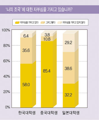 ¶Ç Áß±¹ ´ëÇлýµéÀÇ 59.2%(296¸í)°¡ ÀÚ±¹ÀÇ Á¤Ä¡¿¡ °ü½ÉÀ» °¡Áö°í ÀÖ´Ù°í ´äÇØ °ü½Éµµ°¡ °¡Àå ³ô¾ÒÀ¸¸ç ÀÚ±¹ Á¤Ä¡ÀÇ ½Å·Úµµ(238¸í,47.6%) ¿ª½Ã ÀϺ»°ú Çѱ¹À» ¾ÐµµÇß´Ù. ¹Ý¸é Çѱ¹ ´ëÇлýµéÀº Á¤Ä¡¿¡ ´ëÇÑ °ü½Éµµ(178¸í, 38.4%)°¡ °¡Àå ³·°í ½Å·Úµµ(22¸í, 4.7%)µµ °¡Àå ÀúÁ¶ÇÑ °ÍÀ¸·Î ¹àÇôÁ³´Ù.
