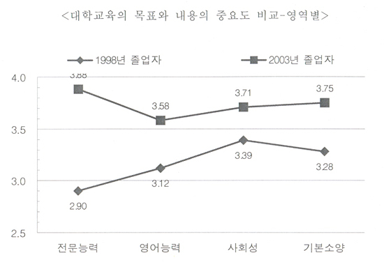 ÀÌ´Â ´ëÇб³À°ÀÌ ¹ÌÄ¡´Â ±â¿©µµ¿¡¼µµ µå·¯³ª 98³â Á¹¾÷»ýµéÀº »çȸ¼º°ú ±âº»¼Ò¾ç±³À°ÀÌ Àü¹®´É·Â±³À°º¸´Ù Å©´Ù°í ¸»ÇÑ ¹Ý¸é, 2003³â°ú 2004³â Á¹¾÷»ýµéÀº Àü¹®´É·Â±³À°ÀÌ »çȸ¼º°ú ±âº»¼Ò¾ç±³À°º¸´Ù ³ô´Ù°í ´äÇß´Ù.
