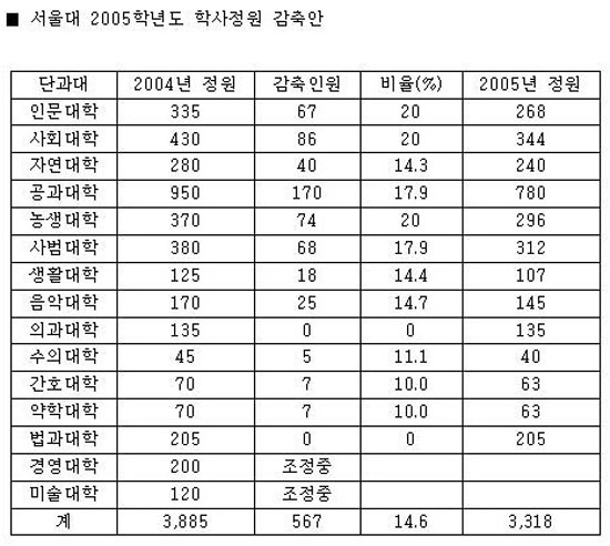 ¼¿ï´ë´Â ÀϺΠ´Ü´ë¸¦ Á¦¿ÜÇÏ°í °¢ ´Ü´ëº°·Î ÇкÎÀÔÇÐÁ¤¿øÀ» ÁÙ¿© 2005Çг⵵¿¡ ¾à 3õ300¿©¸íÀ» ¼±¹ßŰ·Î Çß´Ù°í 14ÀÏ ¹àÇû´Ù. ÀÌ´Â Áö³ÇØ Á¤¿øº¸´Ù 5¹é67¸í ÁÙ¾îµç ÀοøÀÌ´Ù.