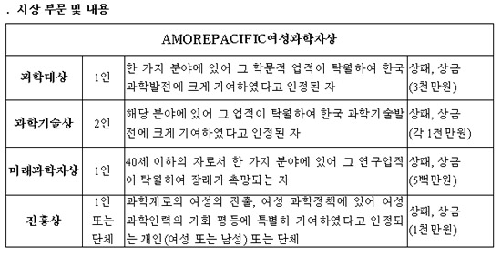 ÃÑ»ó±Ý 65¹é¸¸¿ø ±Ô¸ðÀÇ '¾Æ¸ð·¹ÆÛ½ÃÇÈ ¿©¼º°úÇÐÀÚ»ó'Àº Çѱ¹ÀÇ ¿©¼º°úÇÐÀÚ»óÀ¸·Î´Â °¡Àå Å« »óÀ¸·Î °úÇдë»ó, °úÇбâ¼ú»ó(2¸í), ¹Ì·¡°úÇÐÀÚ»ó, ÁøÈï»ó µî ÃÑ 4°³ ºÎºÐ¿¡ °ÉÃÄ ÀÌ·ç¾îÁø´Ù. <ÇÏ´Ü Ç¥ ÂüÁ¶>