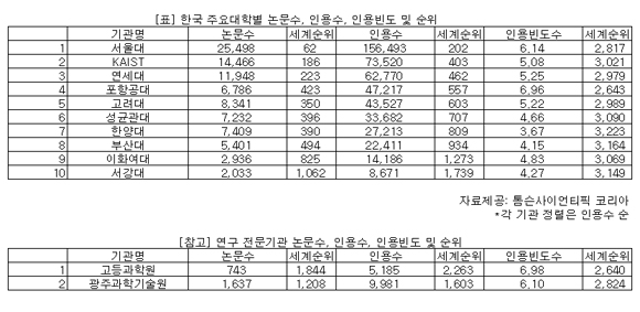 Åè½¼»çÀ̾ðƼÇȻ簡 Áö³ 95³âºÎÅÍ 2005³â±îÁö 11³â µ¿¾È ¼¼°è °¢ ºÐ¾ß¿¡¼ ÀοëȽ¼ö°¡ »óÀ§ 1%¿¡ µå´Â ³í¹®(Highly cited papers)À» Áý°èÇÑ ÀÚ·á¿¡ µû¸£¸é ³í¹® ¼ö³ª ÀÎ¿ë ¼ö¿¡ À־ »óÀ§±ÇÀÌÁö¸¸ ³í¹® 1Æí´ç Æò±Õ ÀοëȽ¼ö·Î´Â 3õ3¹é85°³ ±â°ü Áß 2õ5¹éÀ§ ¾È¿¡µµ ¸ø µå´Â °ÍÀ¸·Î Á¶»çµÆ´Ù.
