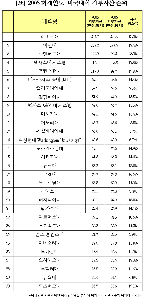 ¹Ì±¹ ´ëÇа濵ÀÚÇùȸ(National Association of College ad University Business Officers¡¤ÀÌÇÏ NABUCO)°¡ ¹Ì±¹ ±¹¸³ ÀçÁ¤ ¼ºñ½º ±â°üÀÎ TIAA-CREF¿Í ÇÔ²² ¹Ì±¹ ´ëÇеéÀÇ Áö³ 2005 ȸ°è¿¬µµ ±âºÎÀÚ»ê°ú ±× ¼öÀÍ·üÀ» Á¶»çÇÑ °á°ú ÇϹöµå´ë°¡ 2¹é54¾ï 7õ3¹é72¸¸1õ ´Þ·¯·Î ¿¹ÀÏ´ë(1¹é52¾ï 2õ4¹é90¸¸ ´Þ·¯)¿Í ½ºÅÄÆÛµå´ë(1¹é22¾ï5¹é¸¸´Þ·¯)¸¦ ¾ÐµµÀûÀÎ Â÷ÀÌ·Î Á¦Ä¡¸ç 1À§¿¡ ¿Ã¶ú´Ù.