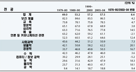 ¿©¼ºµéÀÇ ´ëÇпø °úÁ¤ Á¹¾÷ ºñÀ²À» »ìÆìº¸¸é ¿©¼ºµéÀÇ 'Èû'Àº ´õ¿í ³î¶ø´Ù. Áö³ 1980³â ÀÌ·¡ ¸ðµç °úÁ¤¿¡¼ Áõ°¡Ãß¼¼¸¦ º¸À̰í Àֱ⠶§¹®ÀÌ´Ù. ÀüÅëÀûÀ¸·Î ¿©¼ºÀÌ °¼¼¸¦ º¸¿´´ø º¸°Ç°è¿Àº ¹°·Ð ³óÇÐÀ̳ª ÀÇÇа迿¡¼µµ ¿©¼ºµéÀÌ Â÷ÁöÇÏ´Â ºñÀ²ÀÌ ±ÞÁõÇϰí ÀÖ´Ù.