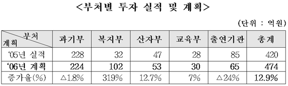 Á¤ºÎ´Â 2006³âµµ ³ú¿¬±¸ÃËÁø ½ÃÇà°èȹ¿¡ µû¶ó ¿ÃÇØ ³ú °ü·Ã ¿¬±¸Áö¿ø±Ý¾×À» 4¹é74¾ï¿øÀ¸·Î Áö³ÇØ 420¾ï¿øº¸´Ù 12.9% ´Ã·Á Áö¿øÅ°·Î Çß´Ù°í 2ÀÏ ¹ßÇ¥Çß´Ù. Á¤ºÎ´Â ¿ÃÇØ ƯÁ¤±âÃÊ¿¬±¸Áö¿ø»ç¾÷À¸·Î 15°³ ³ú °ü·Ã °úÁ¦¸¦ Ãß°¡ Áö¿øÇÏ´Â µî âÀÇÀû ±âÃÊ¿¬±¸´É·Â ¹è¾ç Áö¿ø »ç¾÷µµ °è¼Ó ¼öÇàŰ·Î Çß´Ù.