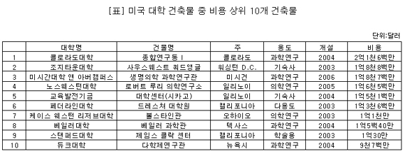 ¹Ì±¹ ´ëÇеé°ú ¿ì¸®³ª¶ó ´ëÇÐÀÇ ÀÚ»ê ±Ô¸ð³ª Çѹ̰£ °æÁ¦ ¼öÁØ¿¡ Â÷À̰¡ ÀÖ¾î ´ëÇÐ °ÇÃ๰ÀÇ °ÇÃàºñ¿ëÀ» ´Ü¼ø ºñ±³Çϱâ´Â ¹«¸®°¡ ÀÖ´Ù. ÇÏÁö¸¸ Àü ¼¼°è °íµî±³À°À» À̲ø¾î ³ª°¡´Â ¹Ì±¹ ´ëÇÐµé ¿ª½Ã ÀÎÇÁ¶ó ±¸Ãà¿¡ Áö¼ÓÀûÀÎ ÈûÀ» ½ñ°í ÀÖ´Ù´Â »ç½ÇÀº ¿ì¸®¿¡°Ô ½Ã»çÇÏ´Â ¹Ù°¡ ³²´Ù¸£´Ù.