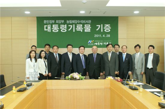 ´ëÅë·É±â·Ï°üÀº 28ÀÏ ÃÖ¾çºÎ Àü ³ó¸²Çؾç¼ö¼®ºñ¼°üÀ¸·ÎºÎÅÍ ¹®¹ÎÁ¤ºÎÀÇ °³ÇõÃßÁø°úÁ¤À» ´ãÀº ±â·Ï¹° 1Â÷ºÐ 800¿©Ã¶(¾à 20»óÀÚ)À» ¹Þ°í ±âÁõÇù¾à½Ä ¹× °¿¬È¸¸¦ °¡Á³´Ù°í ¹àÇû´Ù.