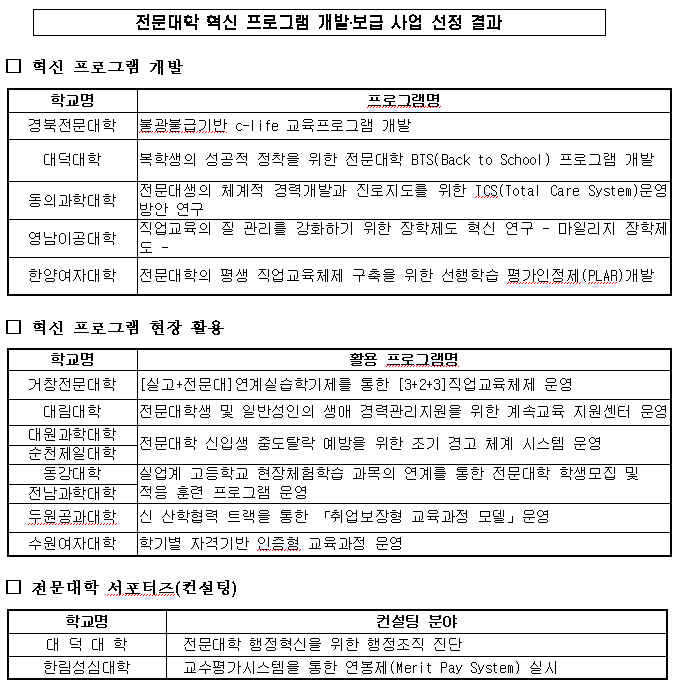 Áö³ÇØ °³¹ßÇÑ Çõ½Å ÇÁ·Î±×·¥À» ÇöÀå¿¡ Àû¿ëÇÏ´Â µ¥ ÇÊ¿äÇÑ °æºñ¸¦ Áö¿øÇÏ´Â ¡®Çõ½Å ÇÁ·Î±×·¥ ÇöÀå Ȱ¿ë Áö¿ø¡¯ ºÎ¹®¿¡¼´Â 2´ë 1ÀÇ °æÀï·üÀ» ¶Õ°í °ÅâÀü¹®´ëÇÐ, ´ë¸²´ëÇÐ, ´ë¿ø°úÇдëÇÐ, ¼øÃµÁ¦ÀÏ´ëÇÐ, µ¿°´ëÇÐ, Àü³²°úÇдëÇÐ, µÎ¿ø°ø°ú´ëÇÐ, ¼ö¿ø¿©ÀÚ´ëÇÐ µî 8°÷ÀÌ ¼±Á¤µÆ´Ù.