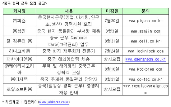 ÇÇÁ¸(www.pigeon.co.kr)Àº ÀÌ´Þ¸»±îÁö Áß±¹ÇöÁö¿¡ ±Ù¹«ÇÒ ¿µ¾÷, ¸¶ÄÉÆÃ, ¿¬±¸¼Ò, »ý»êÁ÷ °æ·Â»ç¿øÀ» »Ì°í ÀÖ´Ù. µ¨ÄÄÇ»ÅÍ(www.dell.co.kr)´Â Áß±¹¿¡ ±Ù¹«ÇÒ °í°´°ü¸®¾÷¹« ´ã´çÀÚ¸¦ »Ì°í ÀÖ´Ù. ¸ðÁý±âÇÑÀº 8¿ù31ÀϱîÁöÀÌ´Ù.