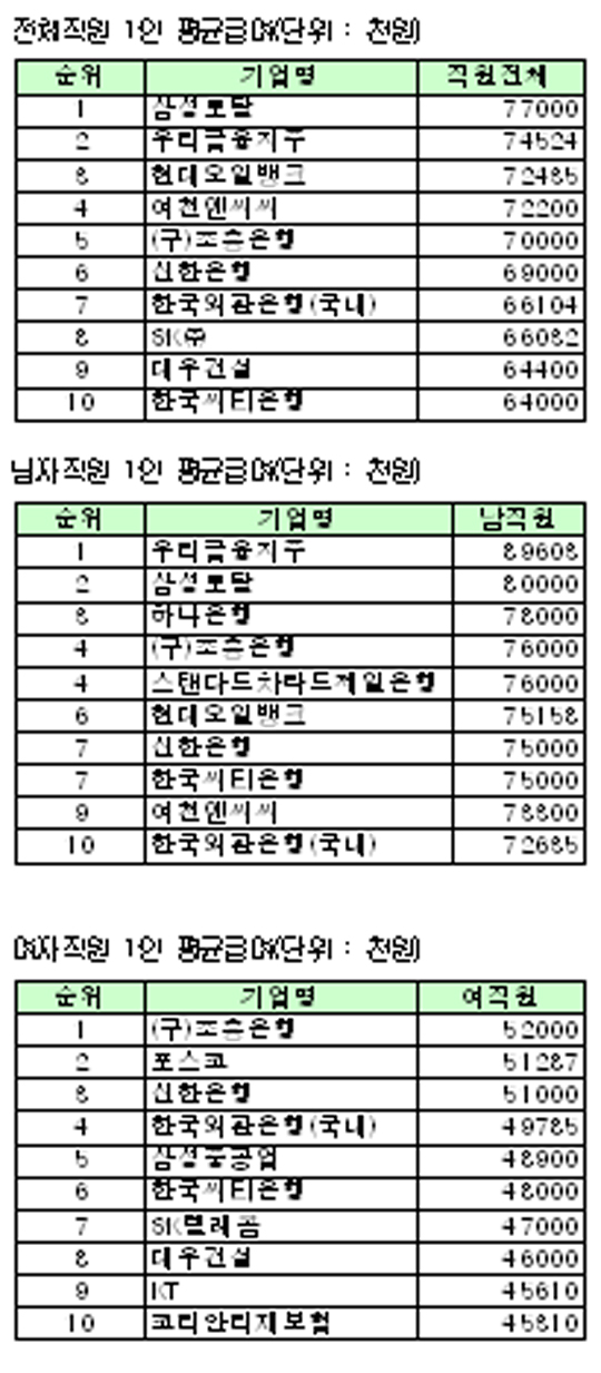 ¿©Á÷¿øÀÇ ±Þ¿©°¡ °¡Àå ³ôÀº ±â¾÷Àº ¿¾ Á¶ÈïÀºÇàÀ¸·Î 5õ2¹é¸¸¿øÀ» ±â·ÏÇß´Ù. Æ÷½ºÄÚ 5õ1¹é29¸¸¿ø, ½ÅÇÑÀºÇà 5õ1¹é¸¸¿ø, ¿ÜȯÀºÇà 4õ9¹é78¸¸¿øÀ¸·Î µÚ¸¦ À̾ú´Ù. »óÀ§ 10°³»ç Áß ºñ±ÝÀ¶±Ç±â¾÷Àº »ï¼ºÁß°ø¾÷ 4õ8¹é90¸¸¿ø(5À§) SKÅÚ·¹ÄÞ 4õ7¹é¸¸¿ø(7À§), ´ë¿ì°Ç¼³ 4õ6¹é¸¸¿ø(8À§) ÄÉÀÌÆ¼ 4õ5¹é61¸¸¿ø(9À§) µîÀ¸·Î Áý°èµÆ´Ù.